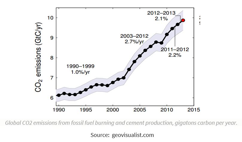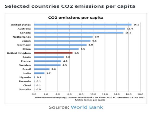 EPA-র (United States Environmental Protection Agency) ২০১৮-এর ড্যাটা অনুযায়ী যুক্তরাষ্ট্রে কষি ৯% এবং পরিবহন ২৯ % গ্রীনহাউস গ্যাস বাতাসে ছড়িয়েছে। মোট পরিবহন দূষণের ৫৯ পার্সেন্টই প্যাসেঞ্জার কারের (বিভিন্ন প্রাইভেট কারসহ)। ট্রাক ২৩%, এয়ারক্র্যাপ্ট ৯%, জাহাজ ও বোট ৩%, রেল ২% এবং অন্যান্য পরিবহনের ছিল ৪ শতাংশ। বিশ্বে কার্বন নিঃসরণের প্রবণতা কতটা সেটা কয়েকটি দেশের গ্রাফিক চিত্রের মাধ্যমে উপস্থিত করা হলো-