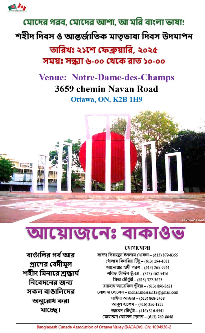 গত কয়েকদিন থেকে অটোয়ার অনেক বাঙালিই ফেসবুকে দেখতে পাচ্ছেন যে ‘বাকাওভ’ বাঙালি সংস্কৃতির প্রধান বাহক “মহান ২১শে ফেব্রুয়ারি” উদযাপনের বিজ্ঞাপন প্রচার করছে। মহান “শহীদ দিবস ও আন্তর্জাতিক মাতৃভাষা দিবস” আগামী ২১শে ফেব্রুয়ারি শুক্রবার বিকাল ৬-০০ঘটিকায় স্থানীয় নটরডাম কমিউনিটি সেন্টার, ৩৬৫৯ নাভান রোড, অরলিন্সে অনুষ্ঠিত হবে। আয়োজকদের তথ্যমতে অনুষ্ঠানটি ভাষা শহীদদের সম্মানে “শহীদ মিনারে” পুষ্পার্ঘ্য অর্পণ, একুশের ইতিহাস ও তাৎপর্য নিয়ে আলোচনা, দেশাত্ববোধক গান পরিবেশনা ও কবিতা আবৃত্তি, ইত্যাদির সমন্বয়ে সাজানো হয়েছে। নিঃসন্দেহে তাদের এই উদ্যোগ প্রশংসনীয়। বাংলাদেশসহ বিশ্বের বিভিন্ন শহরের বাঙালিরা এবছর মহান ২১শে ফেব্রুয়ারি এমন এক সময়ে উদযাপনের প্রস্তুতি নিচ্ছে - যখন বাঙালিরা অস্তিত্ব সংকটে ভুগছে। চলবে…